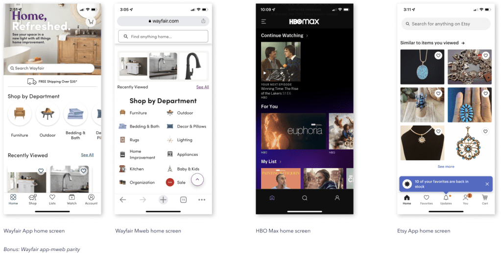 Personalization on the home screen tends to replay most recent user behavior and/or state. Replay helps orient and remind the customer of her previous goals or tasks when she last visited or used the service (HBO Max) which helps to jump start and facilitate re-engagement.