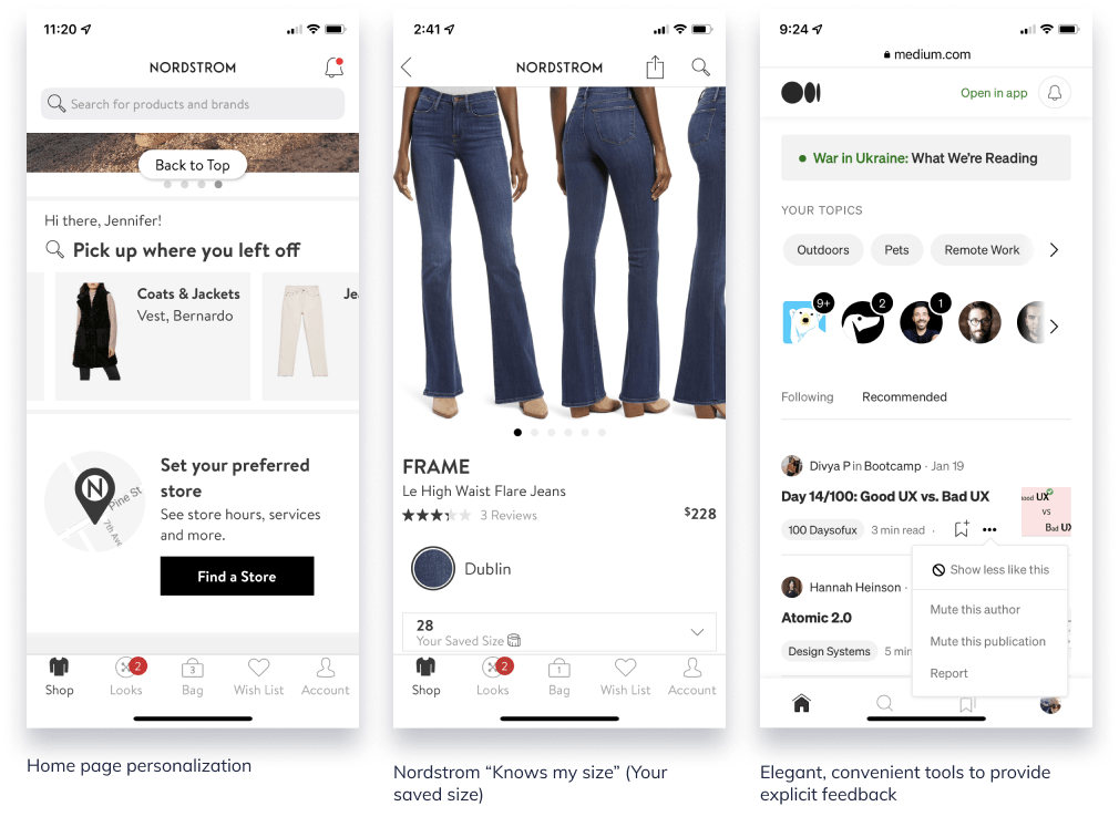 Nordstrom app not only recognizes the user but also knows what size to recommend based on previous browsing and shopping. When she’s on a PDP, it will display the size she normally adds to bag/purchases. It also adjusts to category or measurement (e.g., Size M in pants, Size 28 in designer jeans) - Ability to control the display: Medium and Twitter