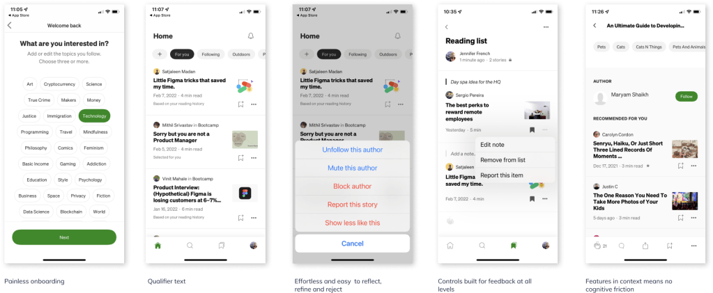 - Medium and Twitter platforms provide users with ability to provide content feedback at most granular level, individual articles and tweets respectively; both platforms have an “onboarding” process initially with suggestions throughout