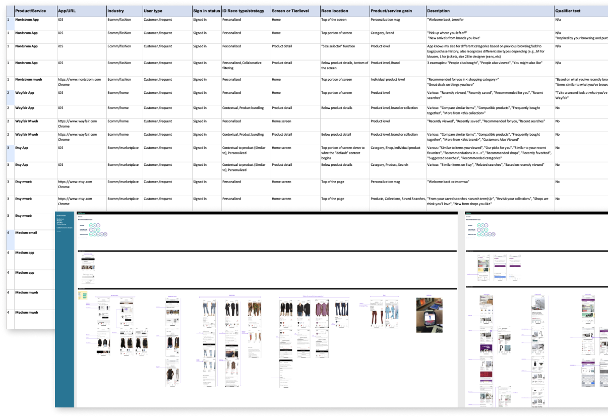 Competitive audits often have the lens of the subject matter applied to them to make cogent observations. Using the content and information recorded in my research of product recommendation systems (Part 1), I created a set of specific “product recommendation” tags and created a lexicon for audit notes. It enabled me to be more aware of what I was looking for and accurately describe it. The lexicon and established vernacular proved useful for other team members because we all used the same language to identify and discuss our observations.