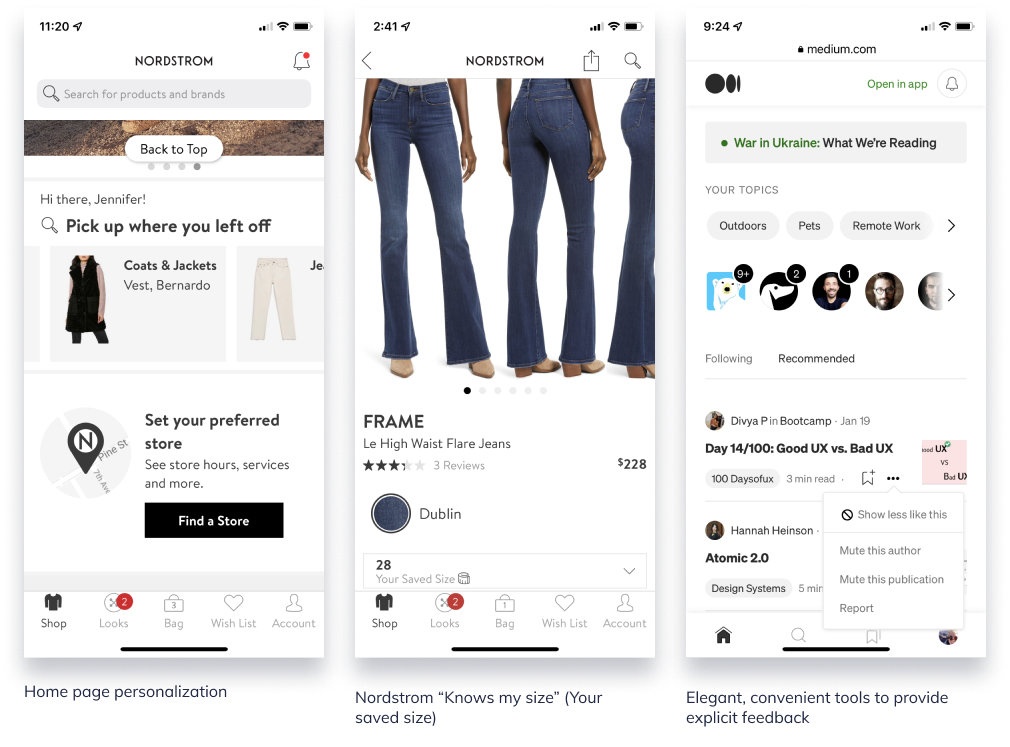 Nordstrom app not only recognizes the user but also knows what size to recommend based on previous browsing and shopping. When she’s on a PDP, it will display the size she normally adds to bag/purchases. It also adjusts to category or measurement (e.g., Size M in pants, Size 28 in designer jeans) - Ability to control the display: Medium and Twitter