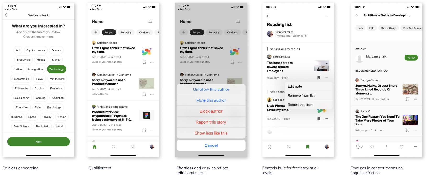 - Medium and Twitter platforms provide users with ability to provide content feedback at most granular level, individual articles and tweets respectively; both platforms have an “onboarding” process initially with suggestions throughout